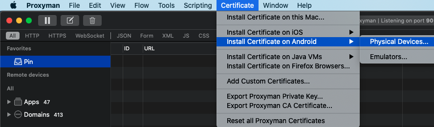 - Mac : ProxyMan 실행 후 메뉴 바 - Certificate - iOS/Android 각 설정 가이드 확인 가능
